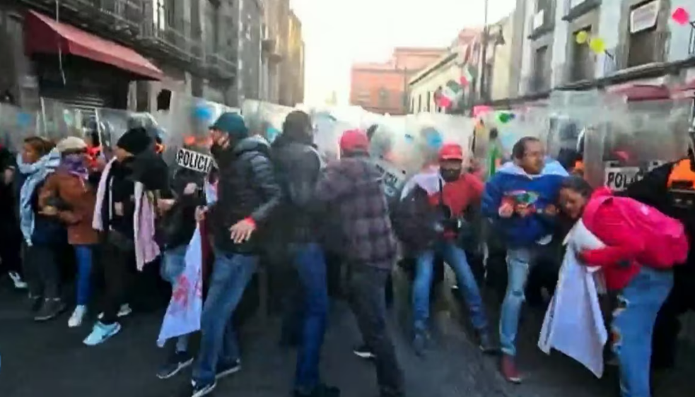 Mientras realizaban un mitin en la esquina de Correo Mayor y Moneda, elementos de la Secretaría de Seguridad Ciudadana (SSC) avanzaron con escudos y empujaron a los maestros, lo que dejó algunos docentes golpeados y elevó la tensión en la zona.