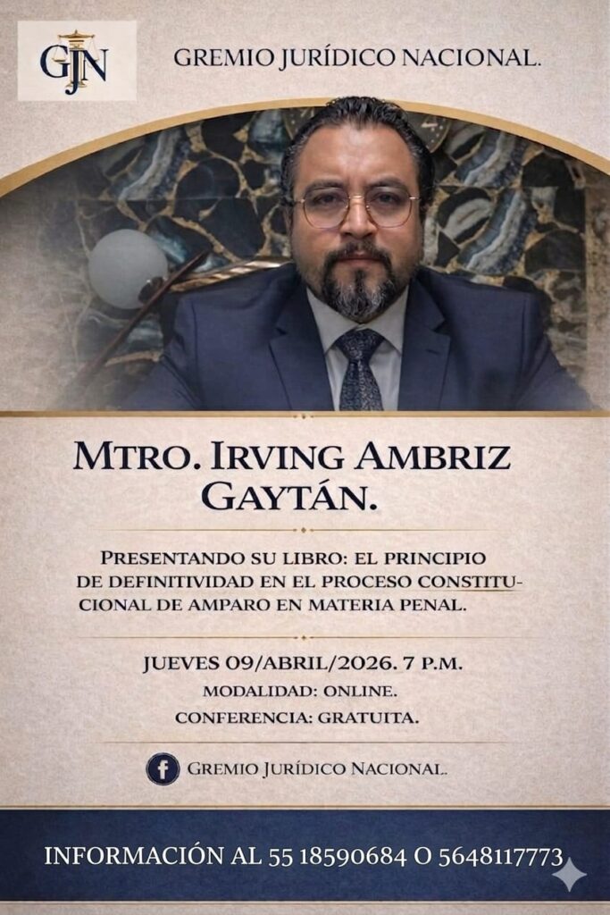 En próximos días, inicia un tour de presentación de su más reciente libro: “El principio de definitividad en el proceso constitucional de amparo en materia penal”,entre estas presentaciones está la del próximo jueves 9 de abril a las 19 hrs. en modalidad on line.