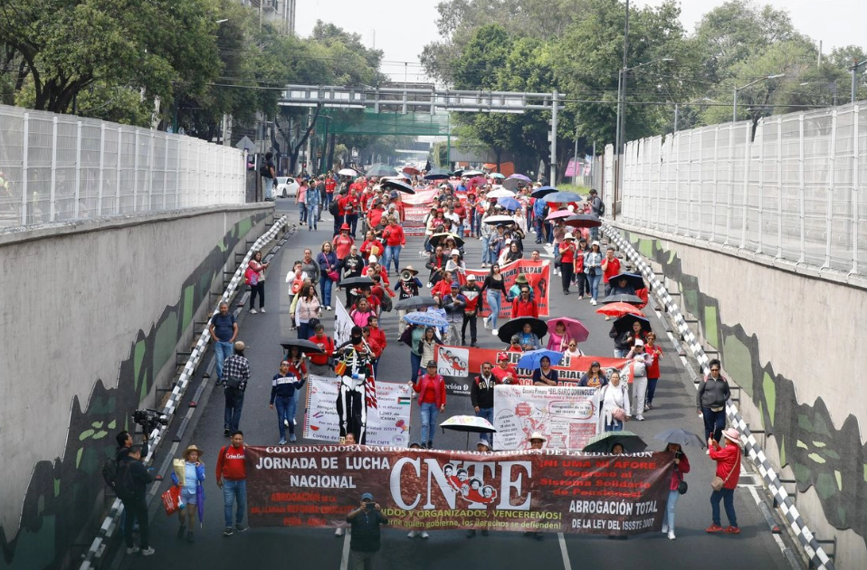 Tras un mitin frente a Palacio Nacional, integrantes de la Coordinadora Nacional de Trabajadores de la Educación (CNTE) de las secciones 9, 10, 11 y 60 anunciaron un receso temporal en su jornada de lucha, aunque advirtieron que retomarán las movilizaciones antes del inicio del próximo ciclo escolar.